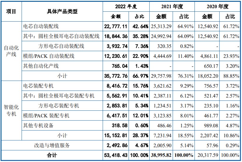 招股书显示,逸飞激光主营业务为精密激光加工智能装备的研发、设计、生产和销售,主要产品包括锂电池电芯自动装配线、模组/PACK自动装配线等自动化产线及各类精密激光加工智能化专机,广泛应用于锂电池、家电厨卫和装配式建筑等行业。报告期内,公司主营业务收入的构成如下: