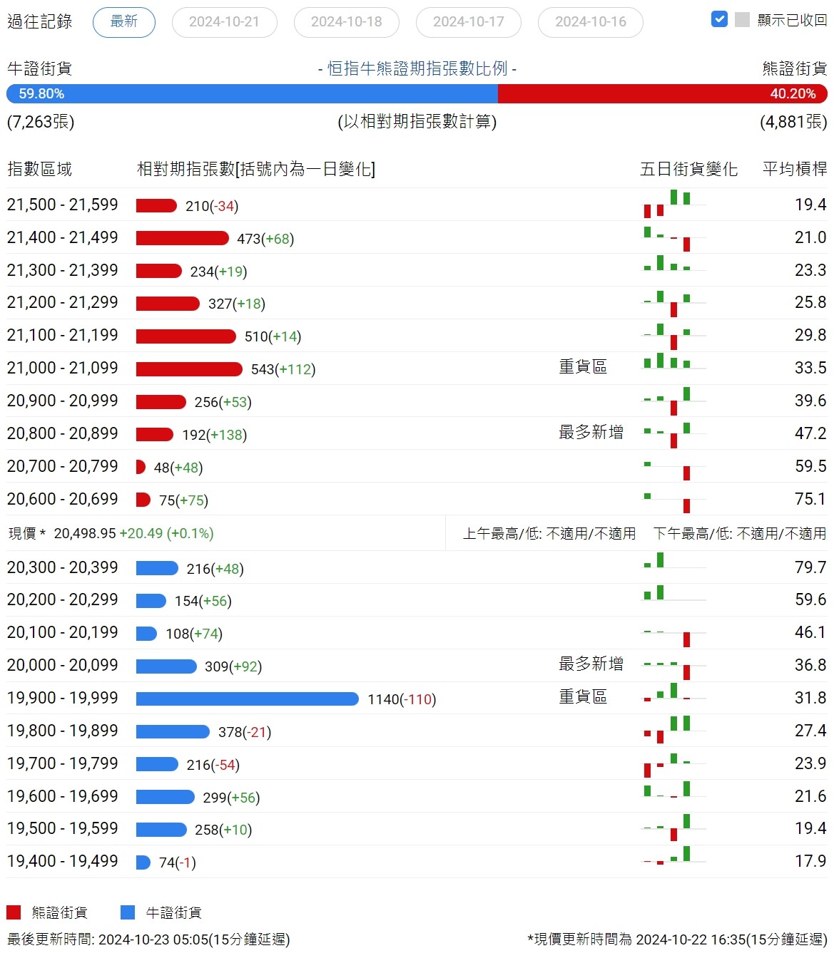 查投资获悉,截至10月23日,恒指最新的牛熊街货比例为60:40。