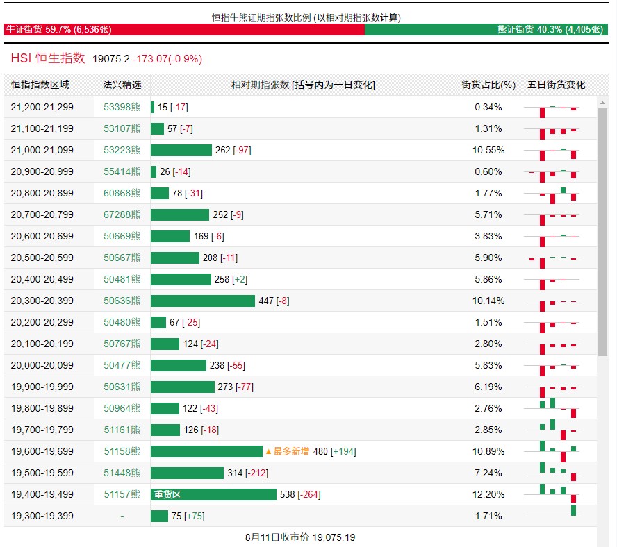查投资获悉,截至8月12日,恒指最新的牛熊街货比例为60:40。