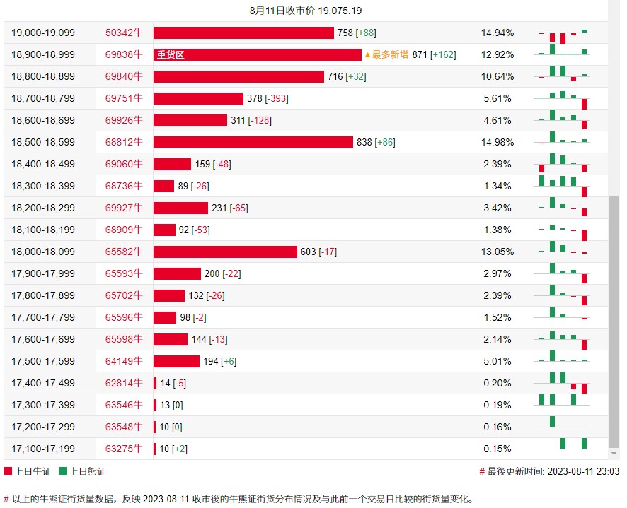 牛证街货重货区和最多新增在18900-18999区间,该区间最新牛证数量为871张,较上一交易日增加162张。