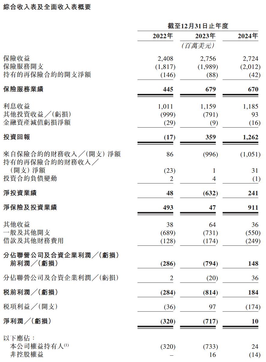 财务方面,于2022年度、2023年度以及2024年度,富卫集团分别实现保险收益24.08亿美元、27.56亿美元、27.24亿美元;保险业务业绩分别为4.45亿美元、6.79亿美元、6.70亿美元;投资回报分别为-0.17亿美元、3.59亿美元、12.62亿美元;净利润分别为-3.20亿美元、-7.17亿美元和0.1亿美元,公司2024年实现扭亏为盈。