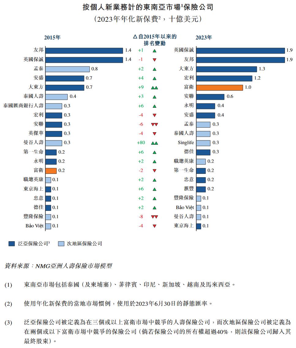 资料显示,富卫集团已从最初的三个市场发展到十个市场,业务遍布中国香港(及中国澳门)、泰国(及柬埔寨)、日本及新兴市场(包括菲律宾、印尼、新加坡、越南及马来西亚)(统称及各自称为“富卫市场”)。公司的东南亚市场(包括泰国(及柬埔寨)、菲律宾、印尼、新加坡、越南及马来西亚)于2024年贡献约50%的新业务合约服务边际。根据NMG的资料,公司于2023年为东南亚市场按年化新保费计的五大保险公司及顶尖银行保险公司。