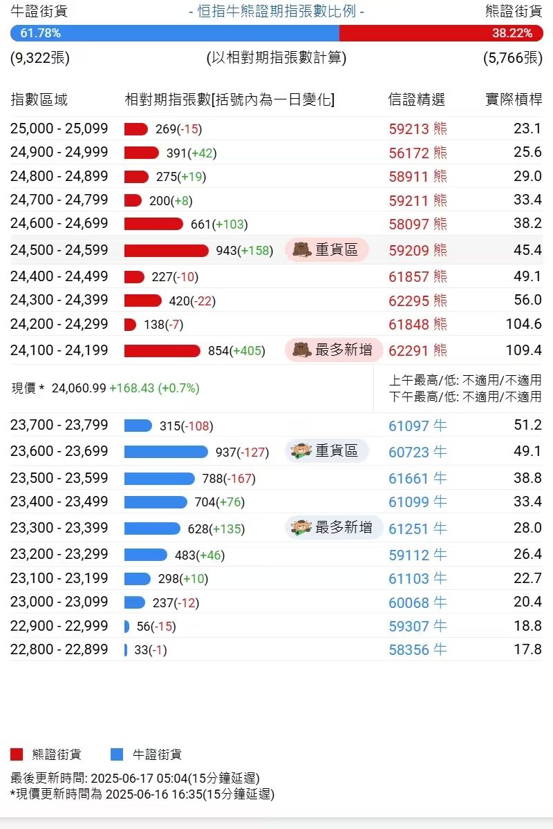中信证券牛熊证街货分布图中的数据显示,熊证街货重货区在24500 - 24599区间,该区间最新熊证数量为943张,较上一交易日增加158张;熊证街货最多新增都在24100 - 24199区间,该区间最新熊证数量为854张,较上一交易日增加405张。