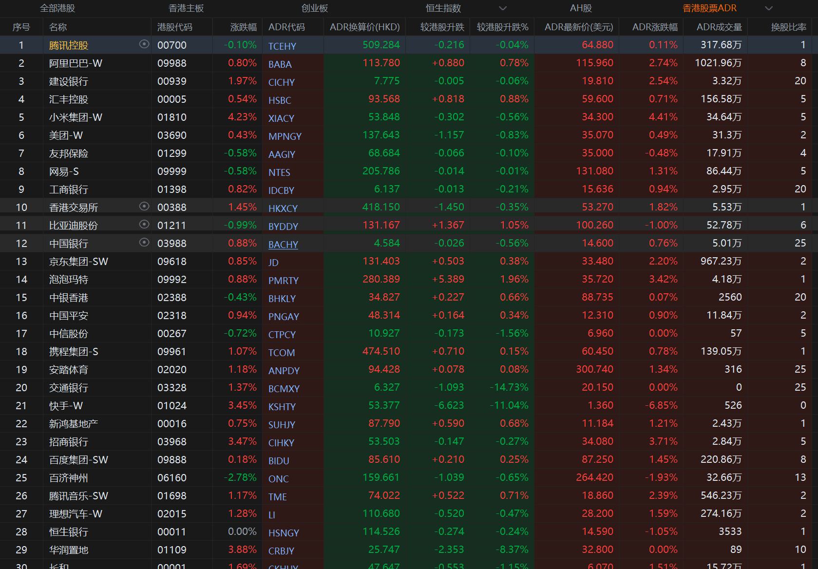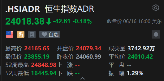 查投资获悉,周一美股三大股指集体上涨,恒生指数ADR下跌,按比例计算,收报24018.38点,较香港收市跌42.61点或0.18%。