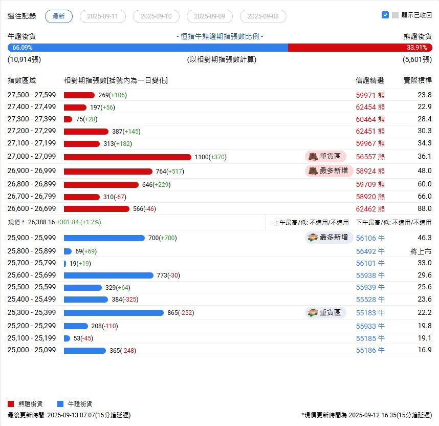 27099区间,该区间最新熊证数量为1100张,较上一交易日增加370张;熊证街货最多新增在26900 - 26999区间,该区间最新熊证数量为764张,较上一交易日增加517张。