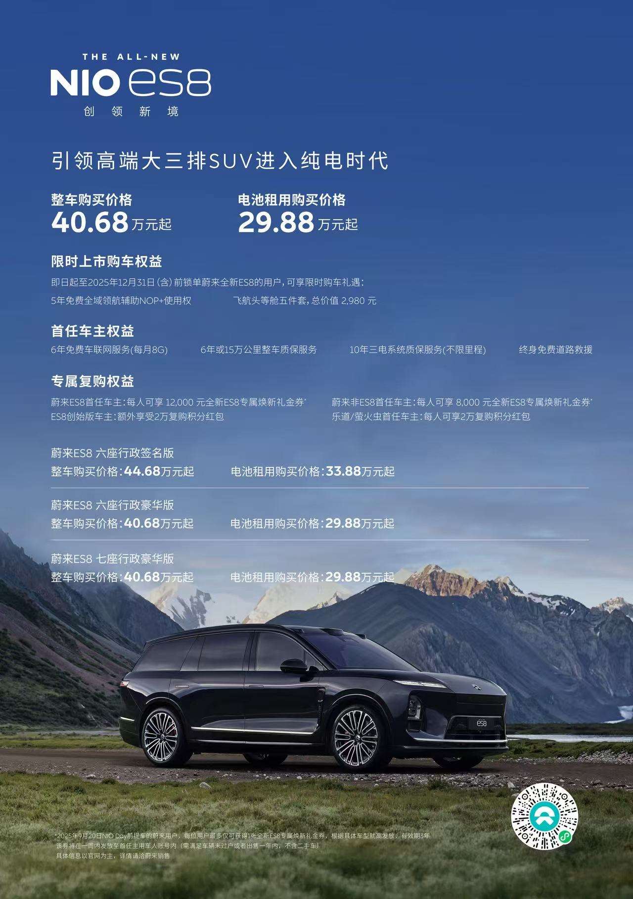 蔚来(09866)全新ES8售价40.68万元起 9月21日起开启交付