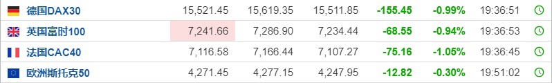 2. 截至发稿,德国DAX指数跌0.99%,英国富时100指数跌0.94%,法国CAC40指数跌1.05%,欧洲斯托克50指数跌0.30%。