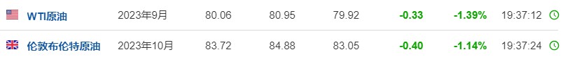 3. 截至发稿,WTI原油跌1.39%,报80.06美元/桶。布伦特原油跌1.14%,报83.72美元/桶。