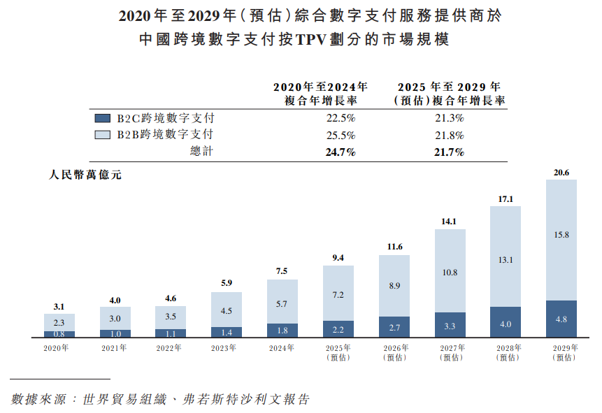跨境数字支付市场,近年来,中国跨境电商市场逐步扩张,这得益于海外市场的强劲需求及先进的数字基础设施及覆盖全球的物流网络发展。电商活动激增继而推动B2C跨境数字支付行业的增长。同时,中国公司扩大海外业务趋势日益明显,这将进一步推动B2B跨境数字支付格局的演变。展望未来,随着全球及中国国内贸易环境持续演变,并在市场持续整合及支付技术进步的支撑下,跨境数字支付市场有望实现增长,这或可提高交易的效率及便利性。按TPV划分的中国跨境数字支付市场规模从2020年的人民币3.1万亿元增长至2024年的人民币7.5万亿元,2020至2024年复合年增长率为24.7%,并预计将于2029年增至人民币20.6万亿元,2025至2029年复合年增长率将达21.7%。