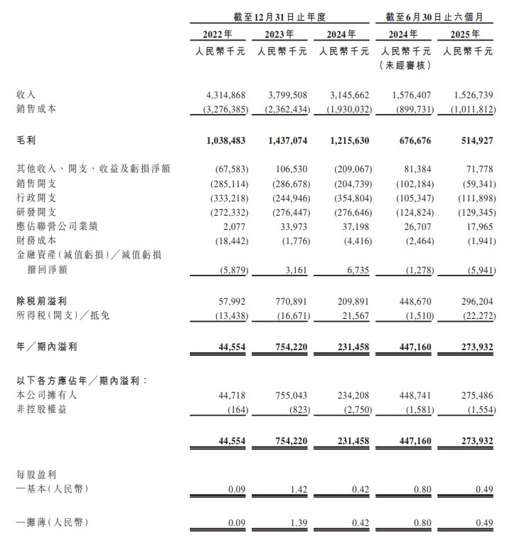 于2022年度、2023年度、2024年度及2025年截至6月30日止六个月,公司分别录得收入43.15亿元(人民币,下同)、38亿元、31.46亿元及15.27亿元。