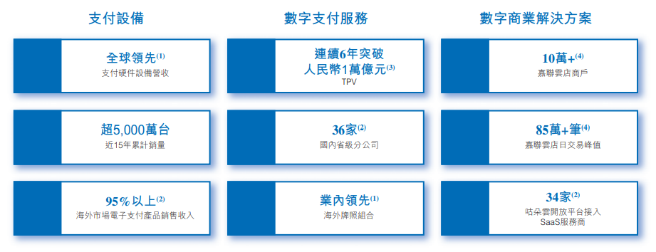 新国都积极把握中国收单行业快速发展的机遇,通过全资附属公司嘉联支付有限公司开展全国范围的收单业务。凭借广泛的合作银行网络,公司已建立起完善的“支付+运营”服务体系,为来自不同行业及各种规模的超过2,000万名客户提供便捷的支付与结算服务。公司的服务主要包括:银行卡收单;二维码收单;以及场景化增值数字解决方案。
