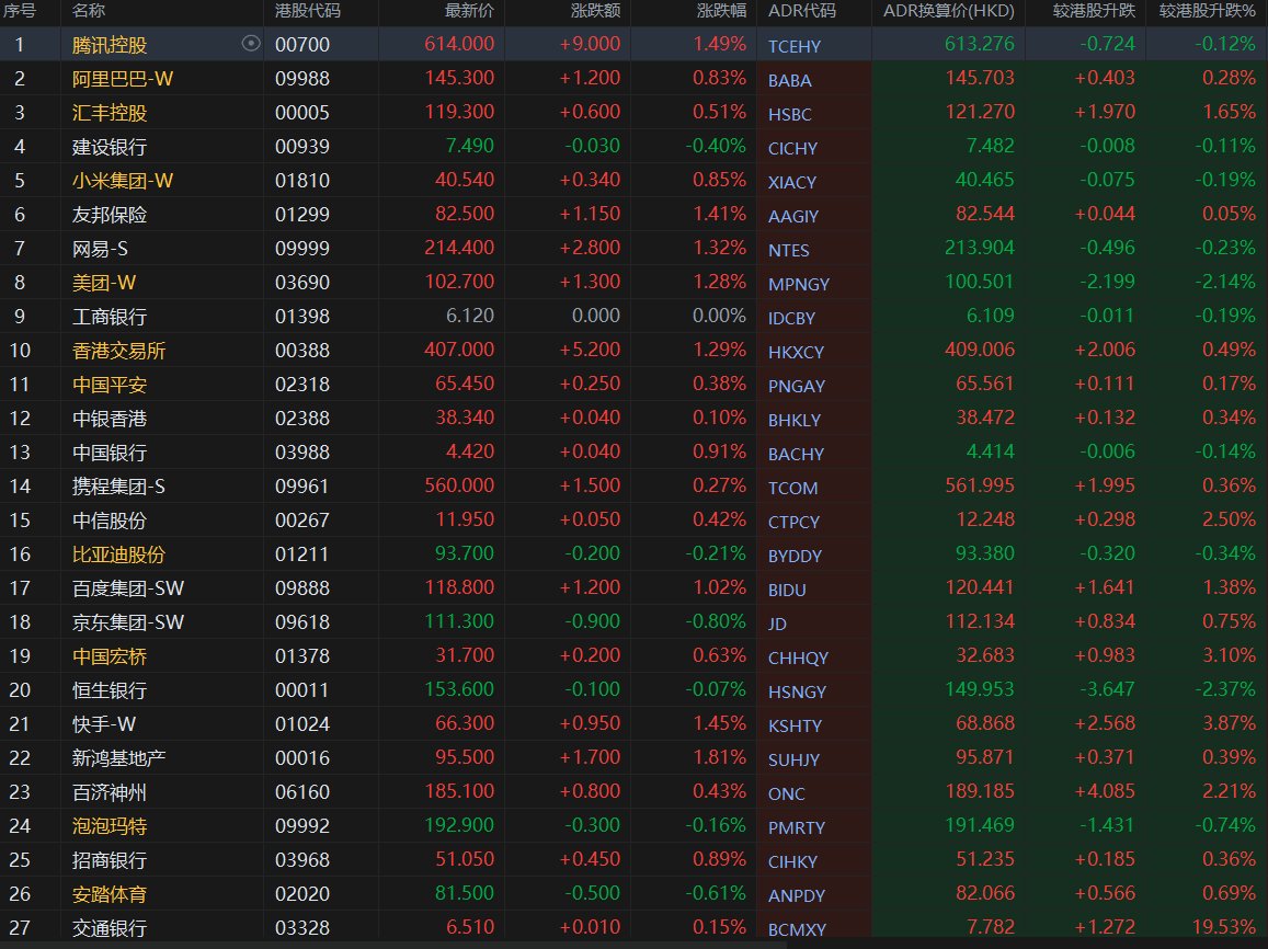 大型蓝筹股涨跌不一,汇丰控股收报121.270港元,较香港收市升1.65%;腾讯控股收报613.276港元,较香港收市跌0.12%。