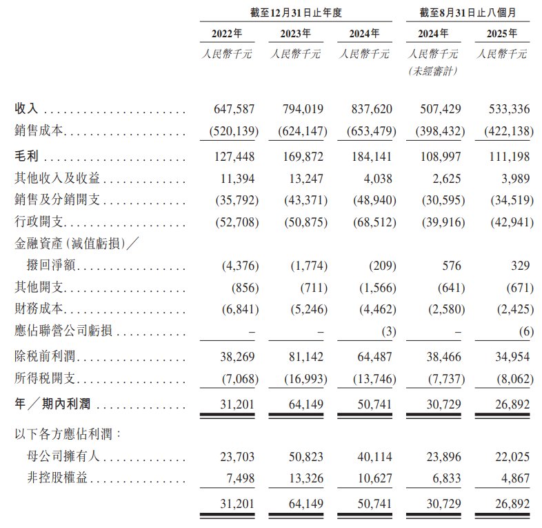 于2022年度、2023年度、2024年度以及截至2025年8月31日止八个月,公司分别录得年/期内利润3120.1万元、6414.9万元、5074.1万元、2689.2万元人民币。