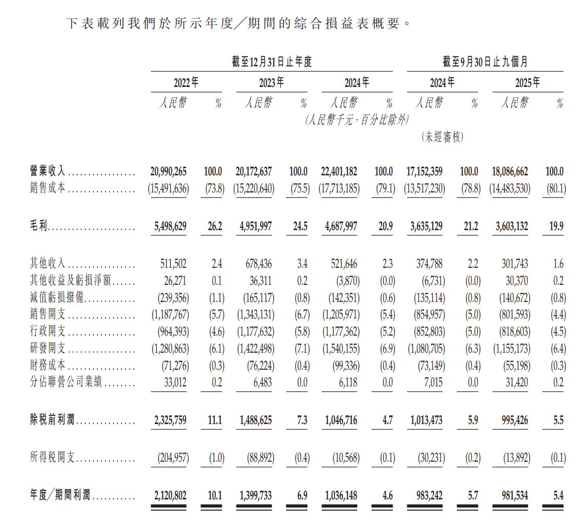 于2022年度、2023年度、2024年度、2025年截至9月30日止九个月,公司毛利分别约约为人民币54.99亿元、49.52亿元、46.88亿元、36.03亿元。
